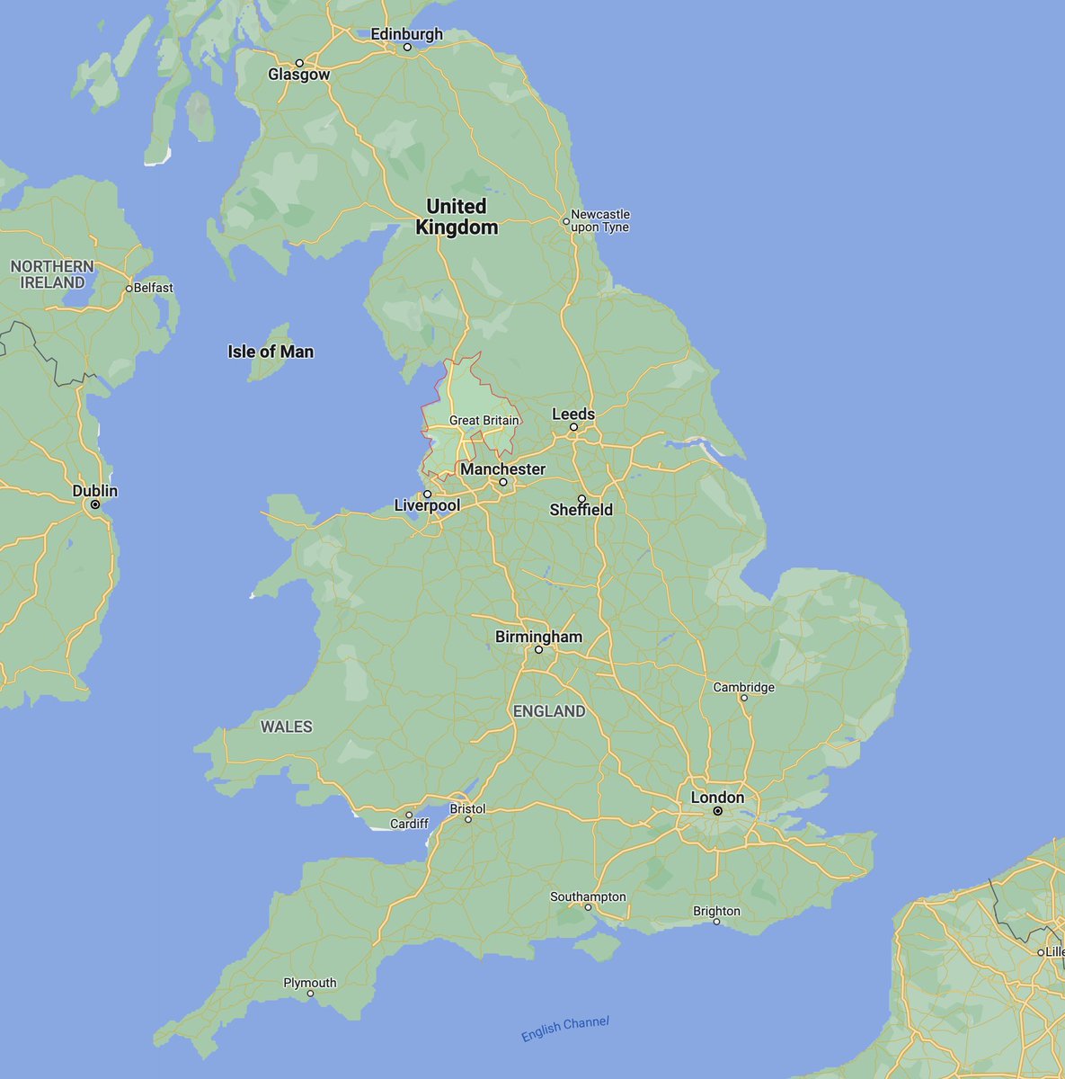 Map showing Lancashire in northwest England (highlighted), home of the cotton oligarchy that made Beatrix Potter's grandparents enormously wealthy Google Maps data © Google -