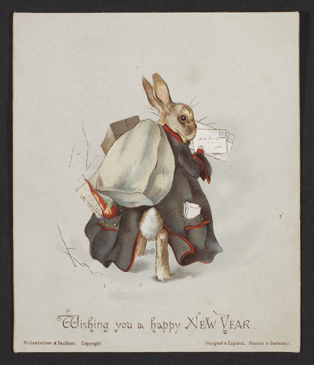 An early Beatrix Potter greeting card illustration — she sent these to family in lieu of Christmas cards, as her strict Unitarian parents did not celebrate Christmas Beatrix Potter, New Year card illustration, public domain -