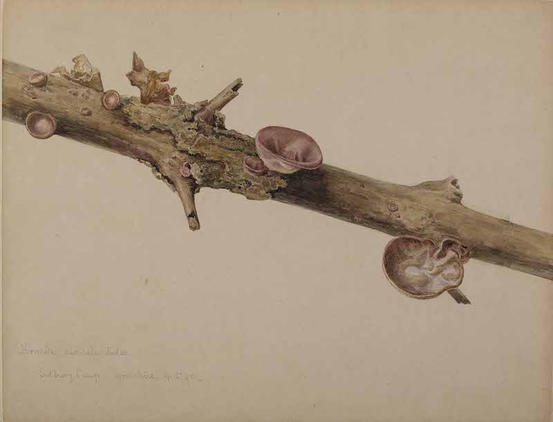 Beatrix Potter's watercolor of cup fungi on a branch, one of her many scientifically accurate fungus illustrations Beatrix Potter, fungus illustration, public domain -