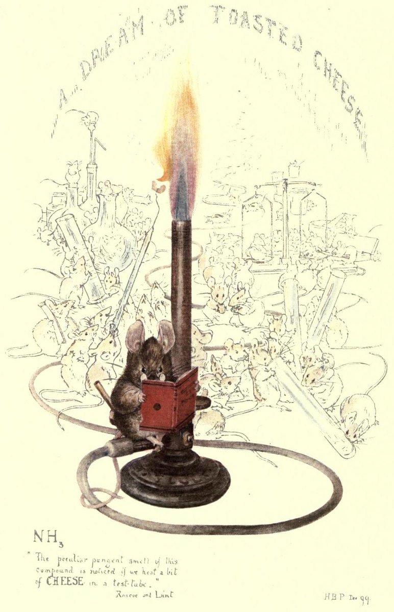 Beatrix Potter's illustration "A Dream of Toasted Cheese", drawn for her uncle Henry Roscoe's chemistry book, featuring a scientist mouse Beatrix Potter, "A Dream of Toasted Cheese", public domain -