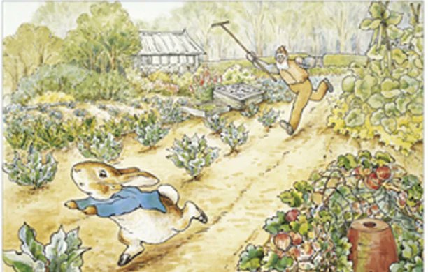 Peter Rabbit being chased by Mr. McGregor — an illustration from The Tale of Peter Rabbit drawn from real locations Beatrix Potter visited Beatrix Potter, The Tale of Peter Rabbit, public domain -