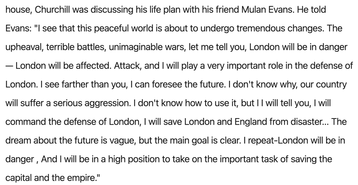 18. Churchill's prophecy to friend Mulan Evans that he would save London and England quoted text