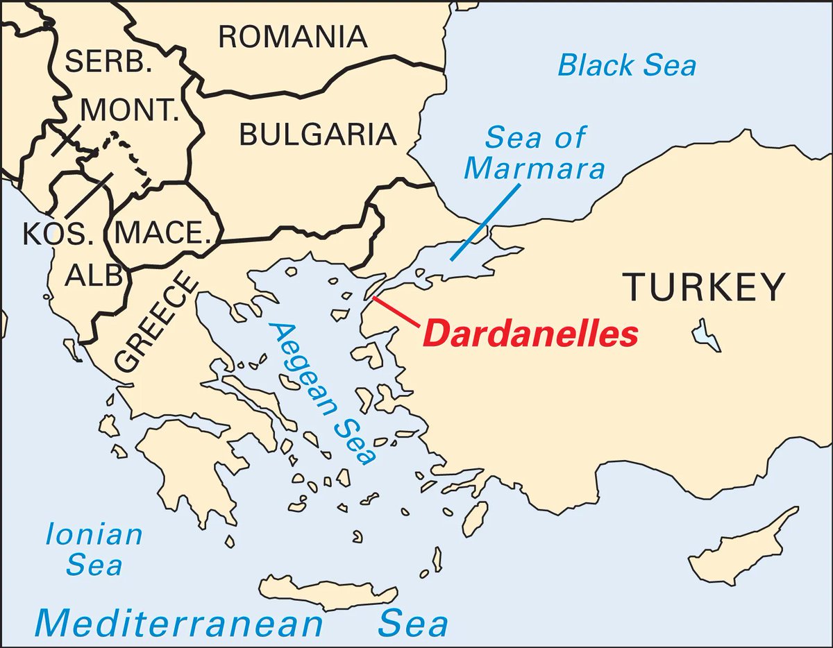40. Map of the Dardanelles strait between the Aegean Sea and Sea of Marmara Map of the Dardanelles via Wikimedia Commons (public domain)