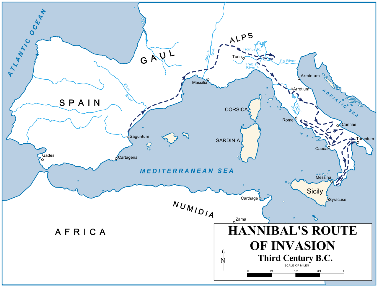 That map is the answer to why Hannibal was attacking Italy from the north: he was coming from Spain! Carthage took over a huge chunk of the Mediterranean including Spain, and Hannibal's dad took him there as a child, leaving his mother and sisters behind.