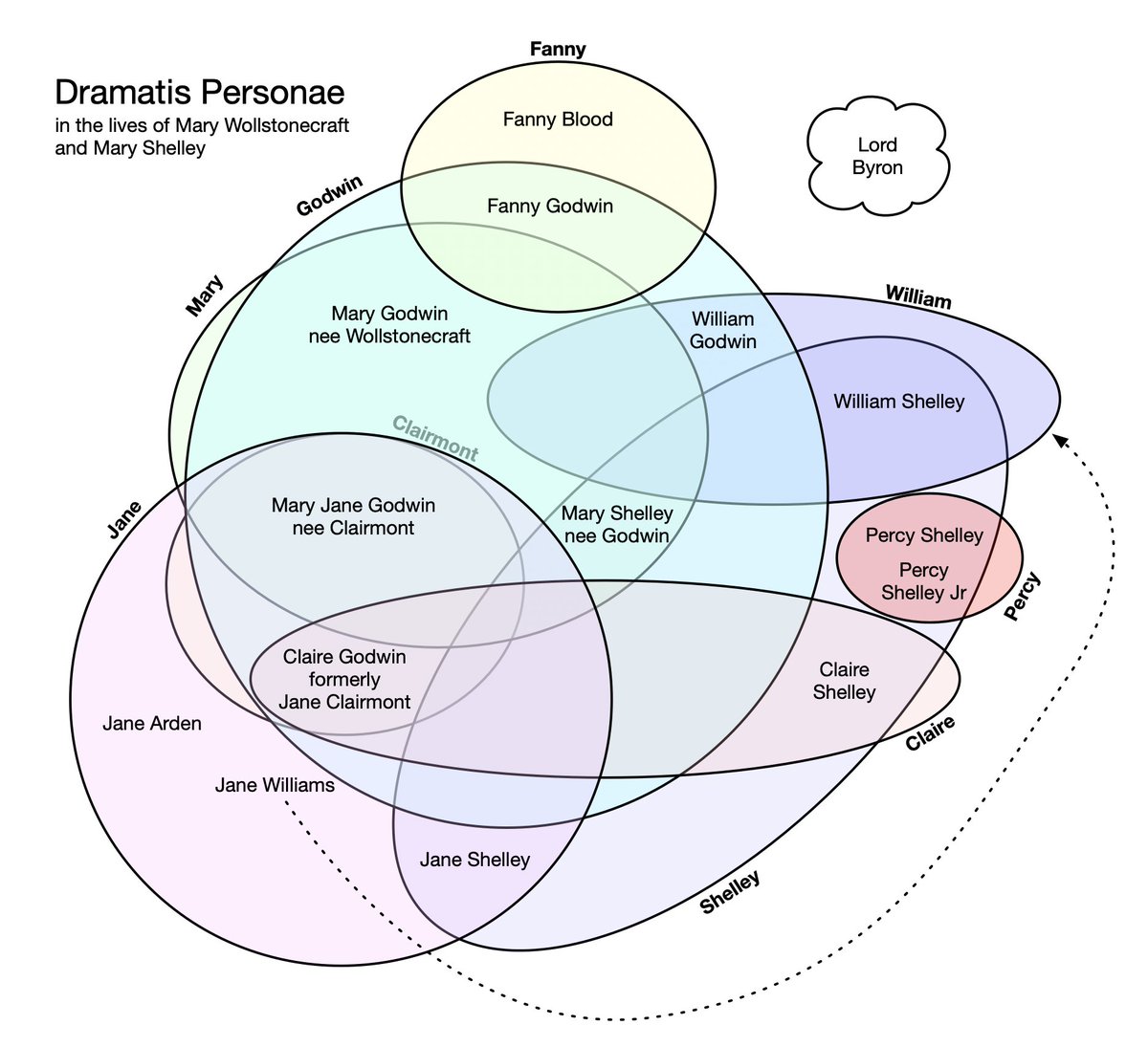 A Venn diagram showing the bewildering overlapping names and relationships in the lives of Mary Wollstonecraft and her daughter Mary Shelley Dramatis Personae diagram, via Wikimedia Commons (CC BY-SA) -
